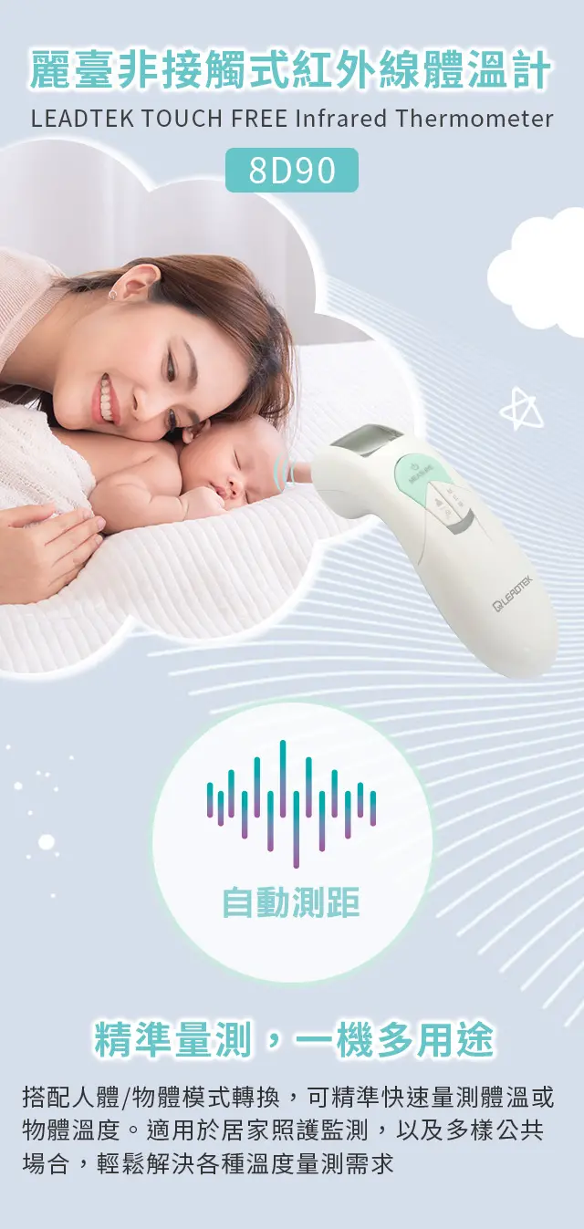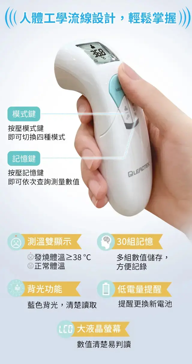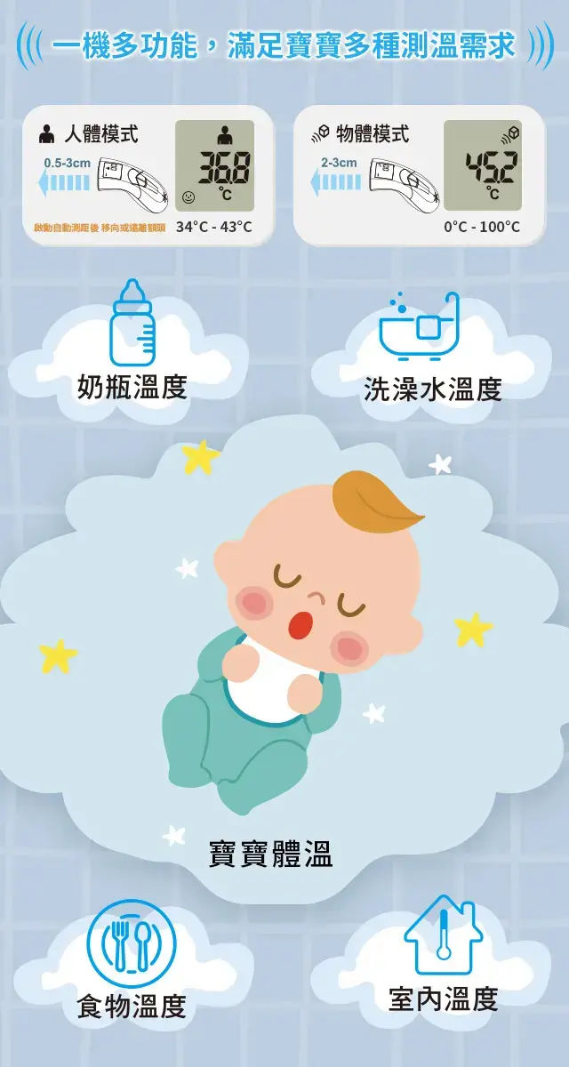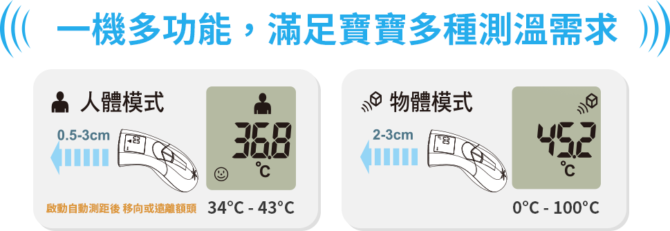 搭配人體/物體模式轉換,可精準快速量測體溫或物體溫度。適用於居家照護監測,以及多樣公共場合,輕鬆解決各種溫度量測需求